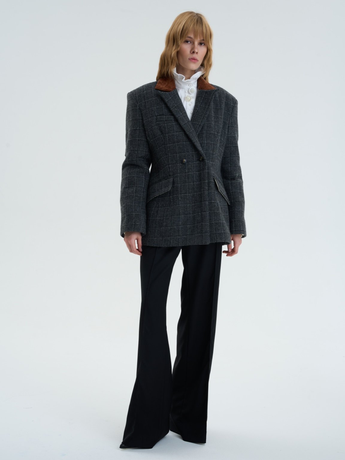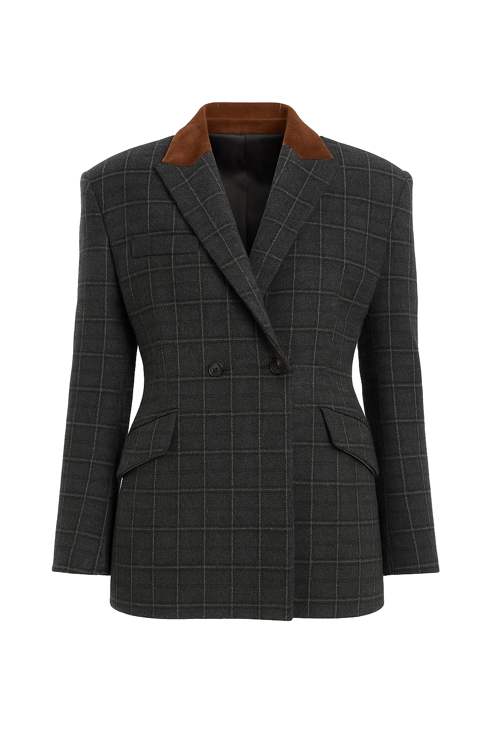 A statement reinterpretation of the classic men’s blazer. Crafted from structured checked wool, this double-breasted jacket features pronounced shoulders, a defined waistline, and a contrasting velvet collar that adds depth and refinement. The silhouette evokes strength and elegance — sharp tailoring with a touch of theatrical charm.