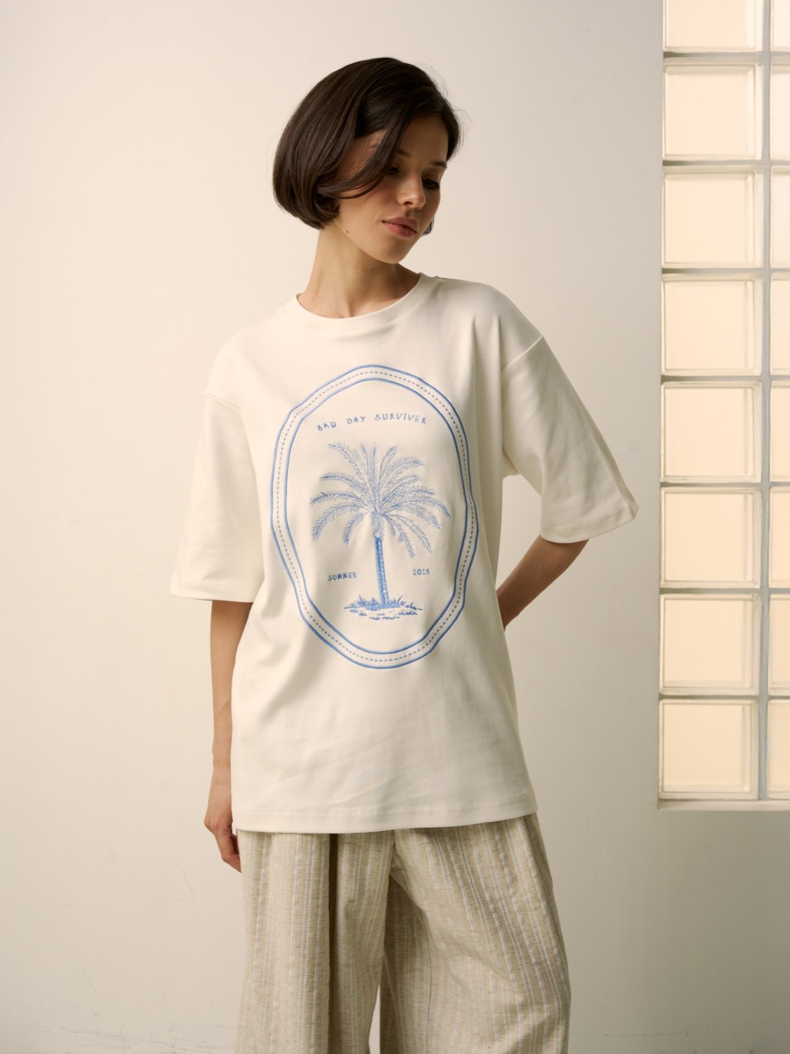 An emblem of quiet resilience. This soft white cotton T-shirt carries an intricate blue embroidery of a palm tree — a symbol of calm strength and endurance. The inscription “Bad Day Survivor" adds a hint of irony and lightness, turning everyday wear into a quiet statement of perspective.