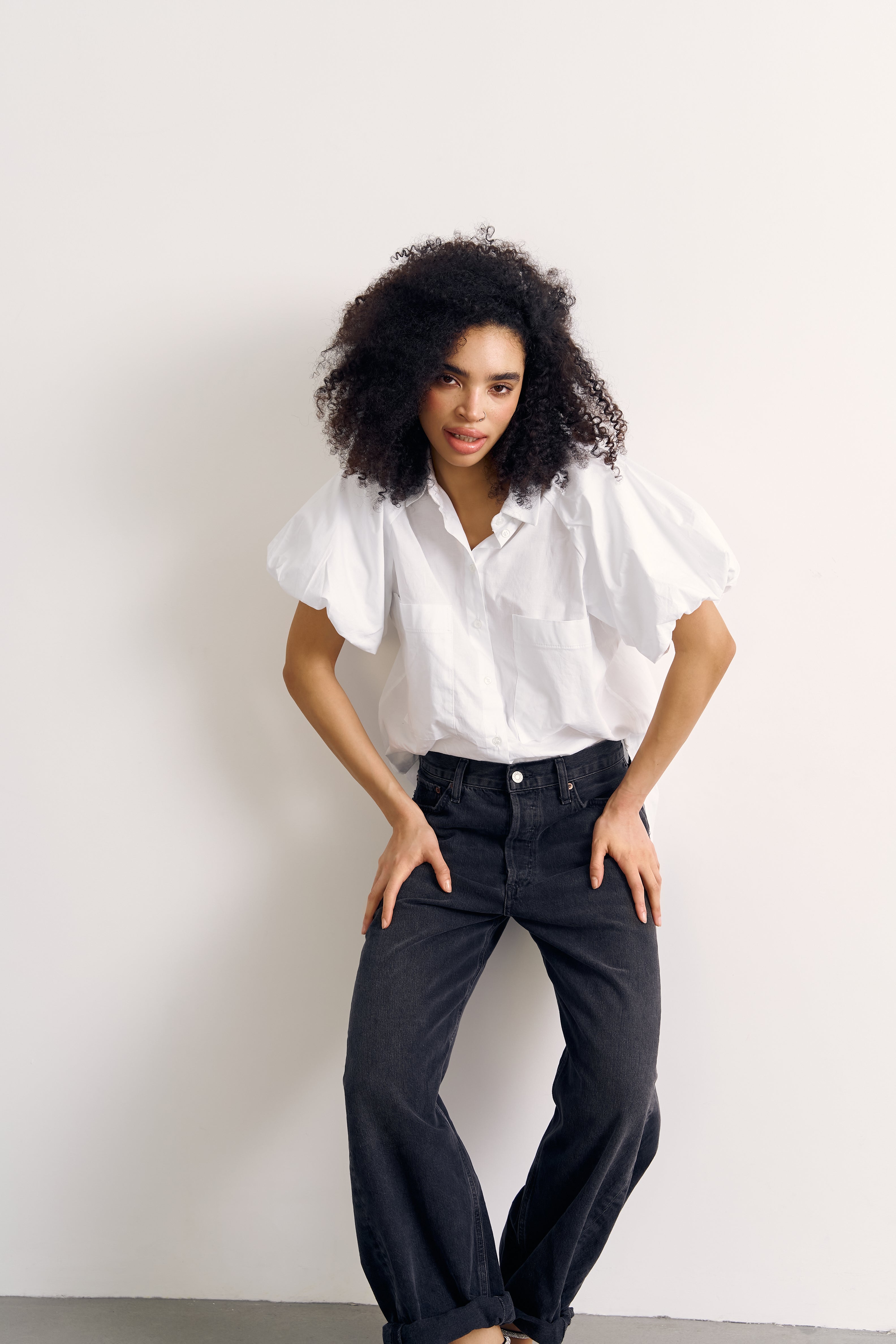 Lightweight and effortlessly elegant, the Pernielle Shirt redefines the classic white shirt with sculptural, wide-cut sleeves and a clean silhouette. Made from crisp cotton poplin, it creates a subtle architectural shape while remaining soft and breathable. The relaxed fit allows for fluid movement, making it an ideal piece for both structured looks and casual layering.